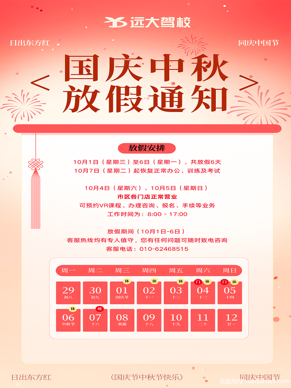 值此国庆佳节来临之际,北京远大驾校全体员工向您致以节日的问候!根据国家放假安排,结合我校实际情况,现将2025年国庆节放假安排通知如下: